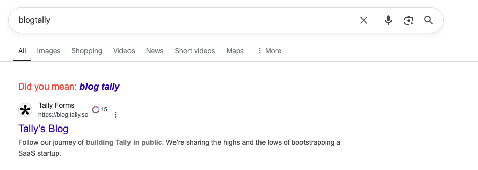 Two months into this journey, I discovered a critical problem: Blogtally had virtually no SEO visibility. The name was too similar to established products like Tally.so and Tally.xyz, and their blogs were dominating search results.